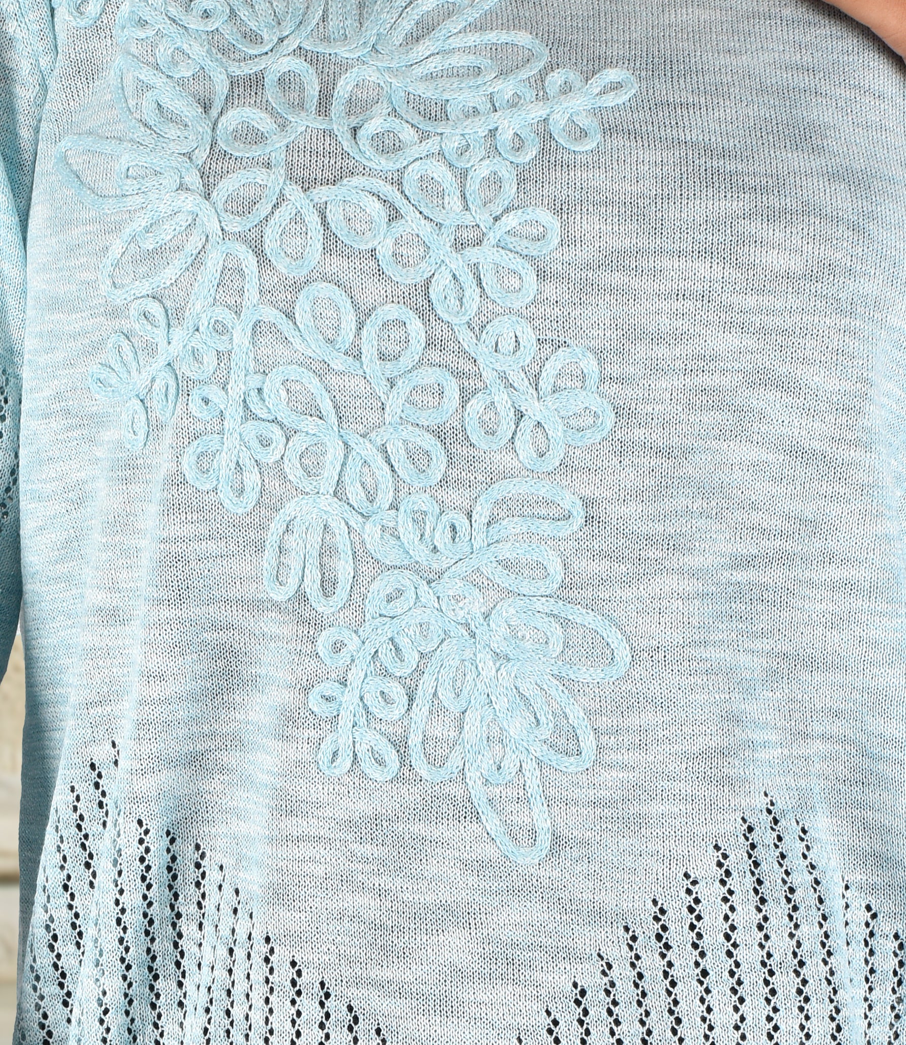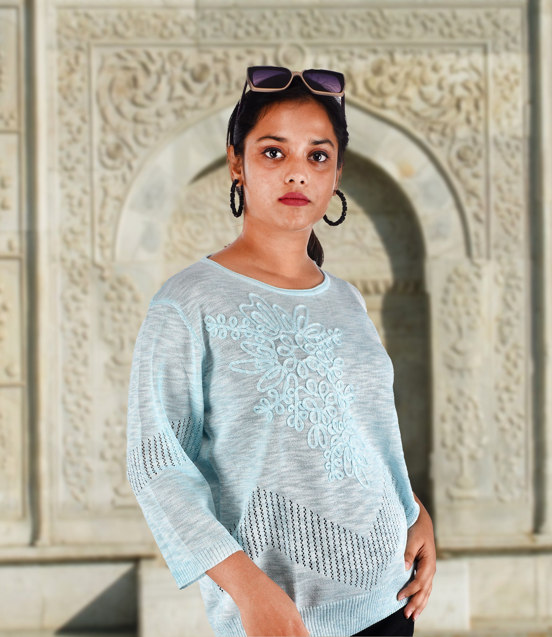 Blue imported lycra western top with rich self-embroidery work. Fully stretchable material, can be worn from size l to xxl.